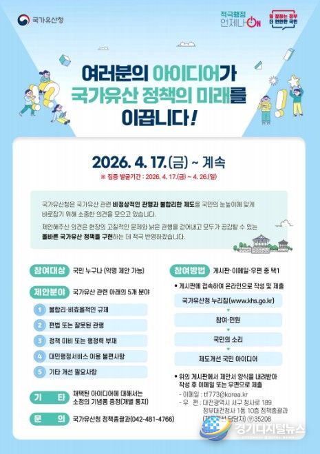 경기디지털뉴스 마성숙 기자 | 국가유산청은 국가유산 관련 비정상적인 관행과 불합리한 제도를 바로잡기 위한 정상화 과제를 발굴하고자 17일부터 국민들의 참신한 아이디어를 받는다.