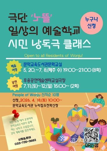 경기디지털뉴스 마성숙 기자 | 문막교육도서관은 5월 20일부터 7월 8일까지 매주 수요일 저녁, 지역 극단 ‘노뜰’의 전문 배우들과 협력해 시민들의 일상을 예술로 물들이는 특별한 예술학교를 운영한다.
