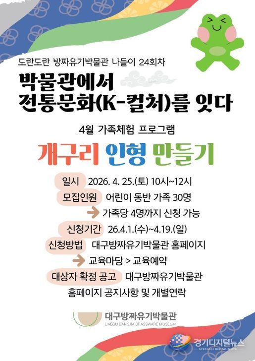 경기디지털뉴스 마성숙 기자 | 대구문화예술진흥원 박물관운영본부 소속 대구방짜유기박물관은 화창한 봄날 4월에 전통공예 가족체험과 팔공산 역사문화 이해 특강을 기획하여, 4월 25일 오전 10시에 ‘개구리 인형 만들기’ 체험을, 4월 28일 오후 2시에 ‘고려 태조 왕건 후백제 견훤과 팔공산’ 강의를 개최한다.