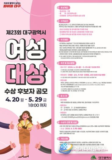 경기디지털뉴스 마성숙 기자 | 대구광역시는 여성의 지위 향상과 양성평등 실현에 공헌한 여성 인재를 발굴·격려하기 위해 ‘2026년 제23회 대구광역시 여성대상’ 수상 후보자를 4월 20일부터 5월 29일까지 공개 모집한다.